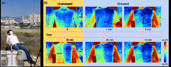 這種“防曬衣”到底有多防曬?在論文里,團(tuán)隊(duì)公布了超構(gòu)織物的一項(xiàng)能測(cè)試,測(cè)試組特地做了一件一半是普通純棉面料一半是超構(gòu)面料的T恤,讓一位測(cè)試者穿著它在2020年12月份的云南西雙版納正午的大太陽(yáng)底下暴曬,將近30分鐘后的溫度測(cè)試表明,超構(gòu)面料遮擋的人體部分相較于普通純棉面料可低3攝氏度。