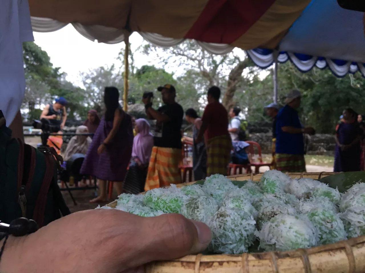 外人光臨,當(dāng)然也要融入民俗,男生裹下半身,女生,在一邊的肩上打一個(gè)結(jié),變成女神感的露肩裝。當(dāng)?shù)厝诉€端來(lái)了點(diǎn)心和山楂茶,綠色的糯米糕外面沾滿了椰蓉,甜甜蜜蜜。