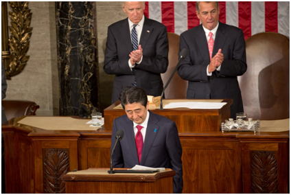 安倍是第一位到美國(guó)國(guó)會(huì)發(fā)表演講的日本首相,他站在美國(guó)重要的權(quán)力平臺(tái)上,花了40分鐘,用英文向美國(guó)議員們展示了一個(gè)“新日本”。2800多字的演講中,“聯(lián)盟”一詞出現(xiàn)了13次,毫不掩飾想要夯實(shí)外祖父岸信介倡導(dǎo)下建立的美日聯(lián)盟的用意。