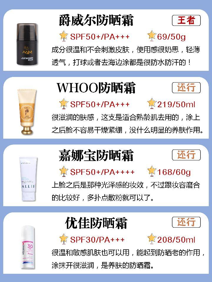 個人覺得,百雀羚和水密碼的防曬霜還是比較好用的,能夠更好的阻礙紫外線對肌膚的侵襲,能夠更好的保護(hù)我們的皮膚。資生堂安熱沙防曬乳。這款防曬霜可以說是老牌子了,不僅防曬能力超強(qiáng),用完可以讓你一個夏天不曬黑,而且它的質(zhì)地也很適合各種膚質(zhì)。碧柔防曬霜。這款防曬霜不僅水潤清透,用完一點(diǎn)都不黏膩,而且價(jià)格也很平價(jià),防曬能力也超強(qiáng)。
