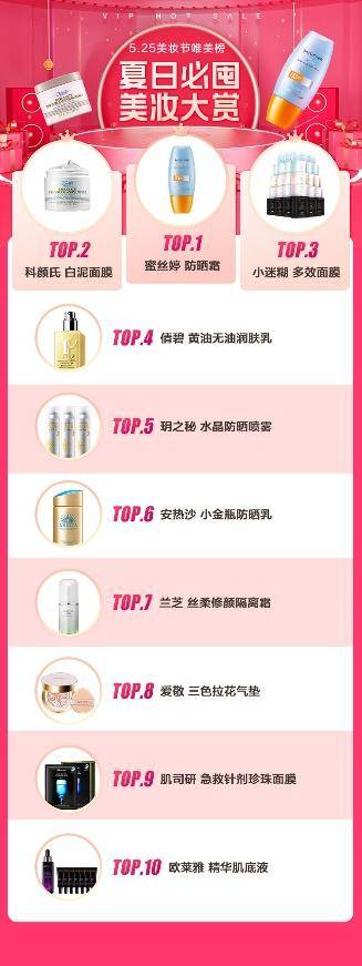 唯品會(huì)發(fā)布的“夏日必囤美妝大賞”顯示,蜜絲婷Mistine小黃帽防曬霜、科顏氏白泥面膜、小迷糊多面膜斬獲前三甲。