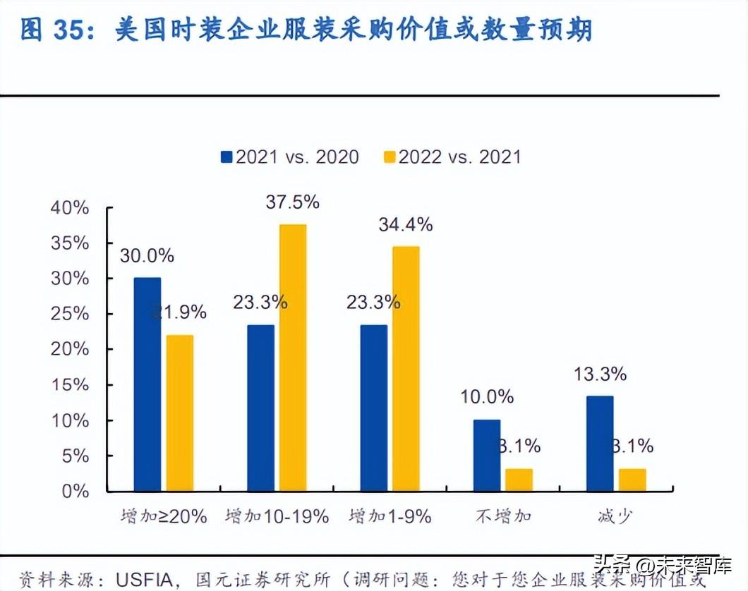 宏觀經(jīng)濟(jì)及供應(yīng)鏈因素影響下,美國紡織服裝業(yè)采購需求更為謹(jǐn)慎。根據(jù)美國時尚 產(chǎn)業(yè)協(xié)會 7 月發(fā)布的調(diào)研,2022 年美國時尚行業(yè)面臨了增長的生產(chǎn)或采購成本、運(yùn) 輸延期和供應(yīng)鏈中斷、美國通貨膨脹和經(jīng)濟(jì)前景等諸多挑戰(zhàn),這些挑戰(zhàn)在未來仍將持 續(xù),其中,認(rèn)為采購成裝成本進(jìn)一步增加的比例較 2021 年提升 15.3pct。由于高通 脹、需求疲軟以及宏觀經(jīng)濟(jì)的其他衰退,近 40%的受訪時尚公司預(yù)計 2022 年財務(wù)狀 況比一年前更糟,比 2021 的 20%翻了一番,只有約 40%的受訪者認(rèn)為財務(wù)狀況將 在 2022 年改良,遠(yuǎn)低于 2021 的 70%。經(jīng)濟(jì)和公司經(jīng)營的不確定性導(dǎo)致服裝采購更 為謹(jǐn)慎,雖然有 93.8%的受訪者預(yù)計他們的采購價值或采購量將在 2022 年增長 (2021年為76.6%),但只有21.9%的受訪者預(yù)計采購價值或數(shù)量將增長20%以上, 較 2021 年的 30.0%顯著下降。