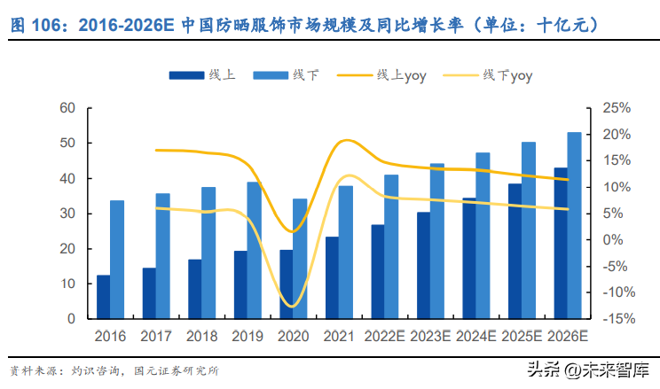 防曬服飾作為生活戶外一大細(xì)分賽道,迎來新發(fā)展機(jī)遇。在日常通勤、休閑運(yùn)動、踏 青遠(yuǎn)足、旅行度假等場景下,消費(fèi)者對抗衰老和皮膚保護(hù)意識提高,相較于防曬霜, 防曬服飾具有無毒無害無刺激性可穿戴等優(yōu)點(diǎn),再加上色彩款式的迭代創(chuàng)新,推動中 國防曬服飾行業(yè)市場規(guī)模增長。根據(jù)灼識咨詢,中國防曬服飾行業(yè)市場規(guī)模從 2016 年的 459 億人民幣增至 2021 年的 611 億人民幣,2016-2021 年 CAGR 為 5.9%, 預(yù)計 2026 年將達(dá) 958 億元,2021-2026 年 CAGR 為 9.4%。