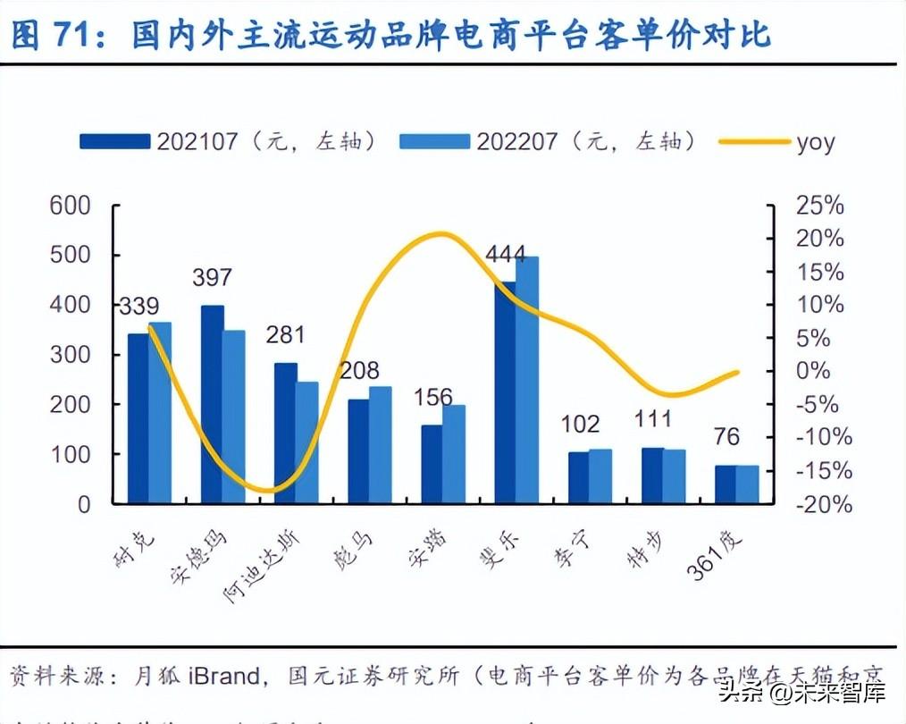 而隨著國產(chǎn)品牌 在產(chǎn)品品質(zhì)、專業(yè)技術(shù)方面的持續(xù)升級,消費(fèi)者對于國產(chǎn)運(yùn)動服飾的觀念發(fā)生轉(zhuǎn)變, 從原來認(rèn)為國貨是低價平替產(chǎn)品、體現(xiàn)愛國情懷,到更關(guān)注產(chǎn)品的款式、風(fēng)格、質(zhì)量, 也更愿意為國產(chǎn)品牌支付溢價。根據(jù)月狐 iBrand 數(shù)據(jù),2022 年 7 月,安踏/斐樂/李 寧的電商客單價分別為 197/496/108 元,分別同比增長 20.7%/10.5%/5.2%。我們認(rèn) 為,隨著國產(chǎn)運(yùn)動服飾產(chǎn)品矩陣完善、功能性細(xì)分化及消費(fèi)者對運(yùn)動品質(zhì)的更高要求, 國產(chǎn)運(yùn)動服飾的產(chǎn)品消費(fèi)均價有望進(jìn)一步提升。