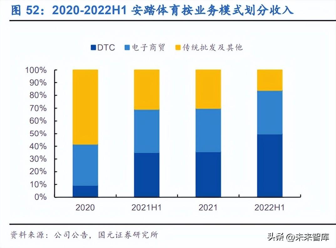 重視 DTC 運(yùn)營,推進(jìn)零售化改革。DTC 模式能夠幫助公司實(shí)現(xiàn)與終端零售的高打 通,更好地監(jiān)控及分配門店庫存,靈活調(diào)整零售折扣,快速回應(yīng)消費(fèi)者需求。安踏自 2020 年 8 月啟動 DTC 模式轉(zhuǎn)型,根據(jù)安踏體育公司公告,截至 2022H1,公司已在 21 個省市采用混合運(yùn)營模式,在 DTC 模式下,總計約 6600 家安踏及安踏兒童門店 中,約 52%由公司直營,48%由加盟商按標(biāo)準(zhǔn)運(yùn)營;DTC 收入為 66.47 億元,同比 增長 79.3%,占總收入的比例為 49.7%,同比提升 14.7pcts。
