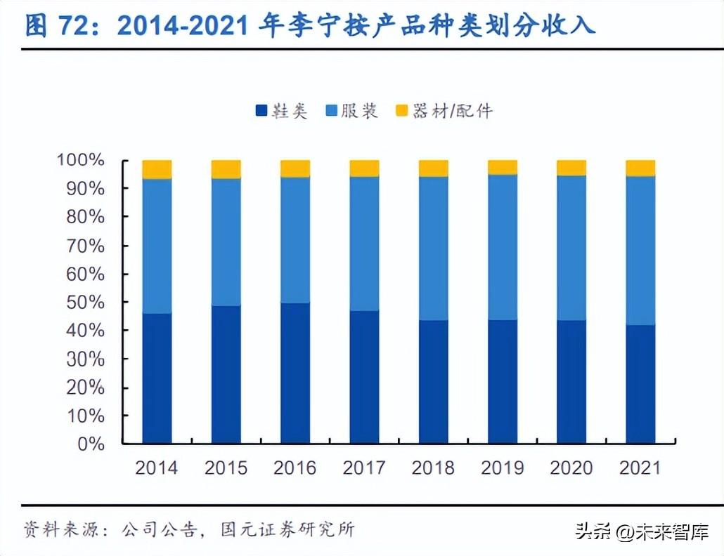 國產(chǎn)運(yùn)動服飾品牌產(chǎn)品矩陣多元化,價格帶呈現(xiàn)上移趨勢。隨著國產(chǎn)運(yùn)動服飾品牌 功能性與時尚感取得突破,一方面,逐步建立起多元化的低中高端品牌&產(chǎn)品矩陣, 給予消費(fèi)者更多元化的消費(fèi)選擇;另一方面,以高科技運(yùn)動鞋為基礎(chǔ)提升品牌調(diào)性, 帶動服飾、器材及配件等銷售占比的提升,進(jìn)一步擴(kuò)大銷售范圍。