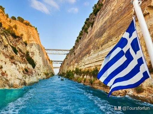 從1881 年到 1893 年建造的,共長(zhǎng) 6.3 千米,為此建造者將科林斯地峽的窄處打通。從此塞隆尼海灣與科林斯海灣之間有了一條通道。科林斯運(yùn)河建成前船要航行 400 千米繞過(guò)伯羅奔尼撒半島。為此建造者必須鑿入 84 米深的巖層,運(yùn)河內(nèi)的水深達(dá)八米,運(yùn)河水面寬 24 米,底部寬 21 米。