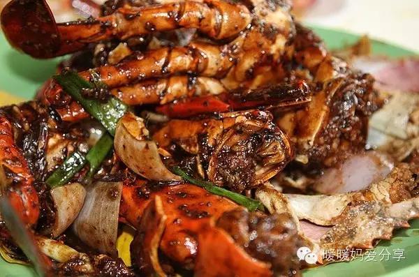 Kelong餐廳有名的是野生龍蝦,每天數(shù)量不定的,捕到幾只就幾只。我們沒(méi)吃(因?yàn)槲蚁淤F),點(diǎn)了黑胡椒螃蟹、石斑魚(yú)、貢貢(一種當(dāng)?shù)氐暮B荩?、海鮮炒飯和空心菜。不得不說(shuō),這里的黑胡椒螃蟹是我吃過(guò)好吃也新鮮的,現(xiàn)在想想都覺(jué)得流口水。石斑魚(yú)我要了兩條小的,一條給暖暖做港式蒸,一條做了我愛(ài)的娘惹蒸。各種海鮮都很新鮮又好吃,價(jià)格跟酒店的比起來(lái)也真心不算貴,十分推薦。