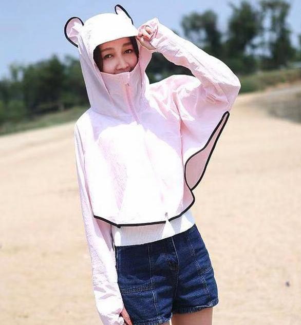這身遮陽帽就很有意思了,帽子與衣服是連在一起的,簡直就是妥妥的防曬衣嘛。連體防曬衣的遮陽帽,百搭又時(shí)尚。而且還是粉色調(diào)的,更顯甜美減齡風(fēng)。不過里面的衣服,好是要穿短款的,不然露出來可就不好看了。