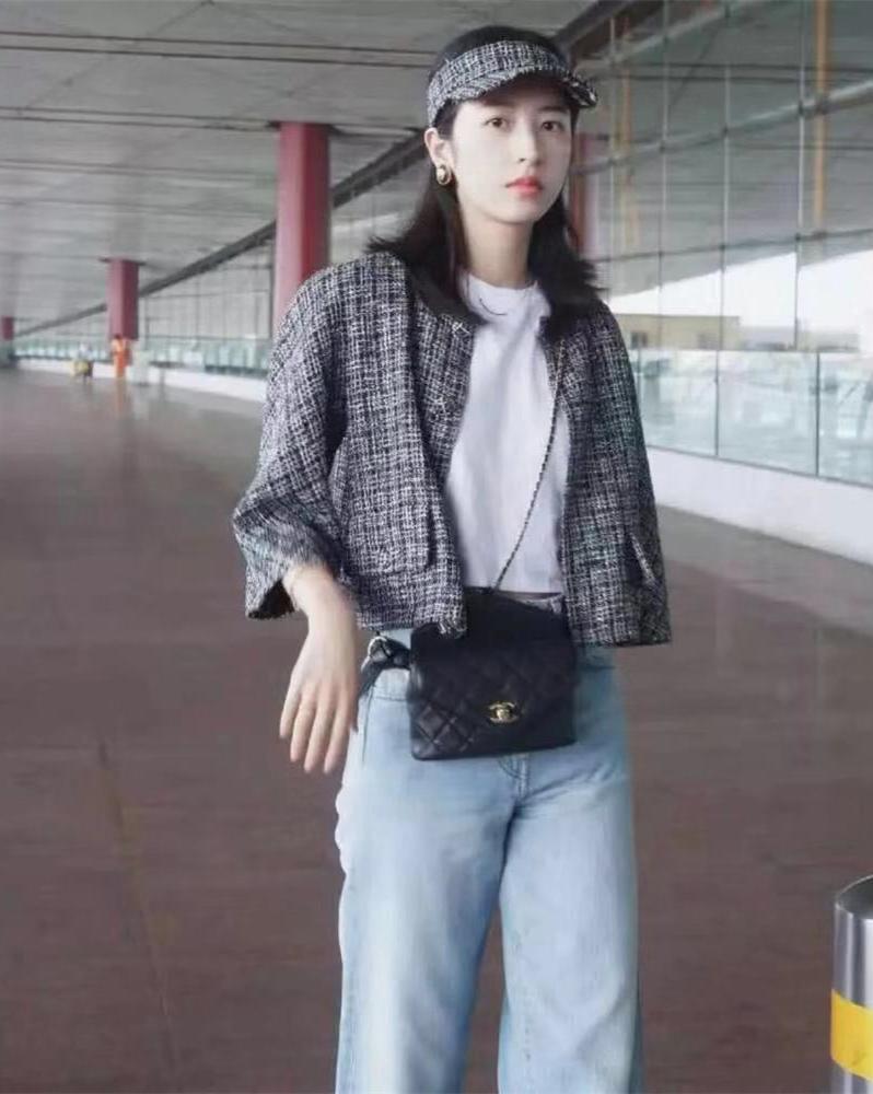 周雨彤白T配牛仔褲,再配合外套,還是很酷的。頭上的遮陽帽,又美又可以防曬,與外套一模一樣,很是般配。不得不說這帽子的加入,使整個(gè)造型時(shí)尚了很多,搭配衣服,飾品還是重要的哦。