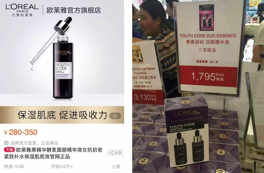 由于價(jià)格較低,泰國(guó)巴黎歐萊雅一般以套裝的形式出售,比如說(shuō)青春密碼肌底液。國(guó)內(nèi)官網(wǎng)售價(jià)280元一瓶,免稅店兩瓶只要1795泰銖(約359元)。