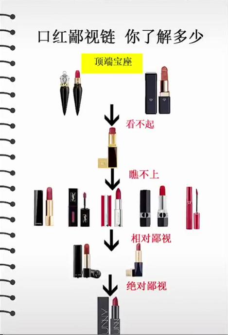 之前網(wǎng)上流傳的一張“口紅鄙視鏈”圖片備受關(guān)注,其中大都是耳熟能詳?shù)钠放啤?/p>