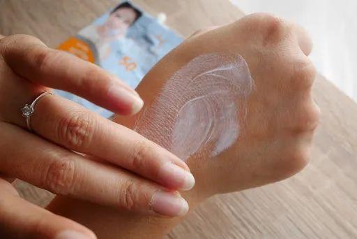 空氣奶霜質(zhì)地,不油膩不悶痘 輕薄,推開(kāi)后絲滑服帖,吸收很快,成膜后跟肌膚融為一體。這款就是典型的物化結(jié)合的防曬,既做到了化學(xué)防曬的膚感輕薄,又具備物理防曬的溫和不刺激▼