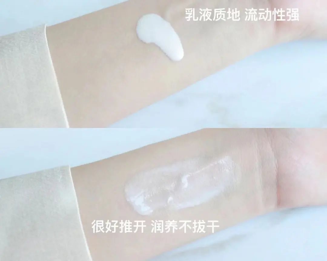淡粉色的水漾質(zhì)地,流動性好,涂在手臂上直接流了下去!肉眼可見的輕薄水潤,但完全不影響它的防曬力。