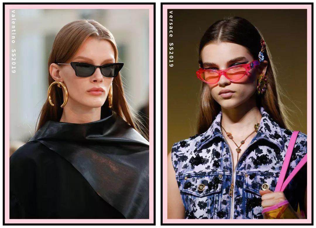 比如19春夏的秀場(chǎng),很多都是類似的風(fēng)格。像Versace、valentino這種貓眼款雖然是從復(fù)古風(fēng)來(lái)的靈感,但是設(shè)計(jì)師則會(huì)更大膽,比如彩色的透明邊框或者說(shuō)更夸張的形狀。