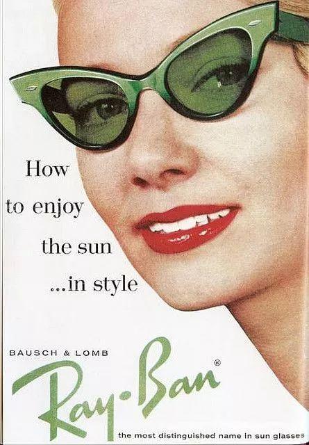 首先,貓眼墨鏡一定要擁有姓名,因?yàn)樗呀?jīng)在歷史的長(zhǎng)河中火了一次又一次了。比如這張雷朋上世紀(jì)50年代的海報(bào),綠色貓眼墨鏡真的前衛(wèi)。