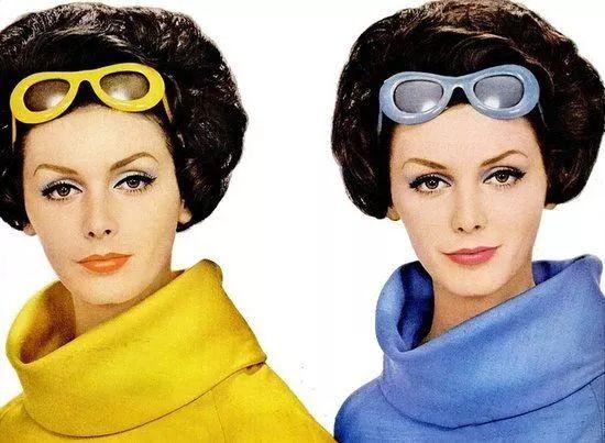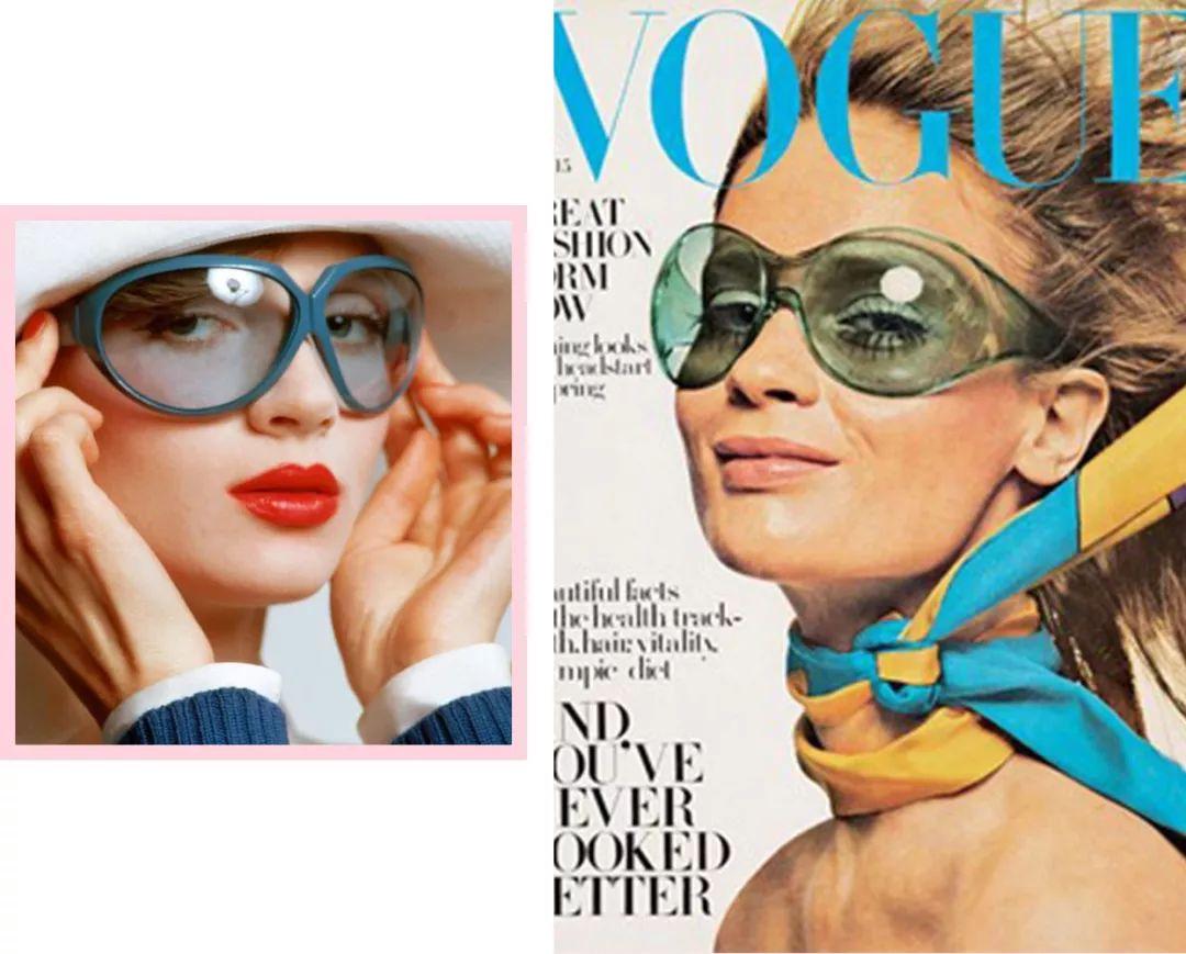 到了60年代,因?yàn)椤鞍⒉_計(jì)劃”讓大家對(duì)于太空充滿了向往,出現(xiàn)了很多前衛(wèi)摩登的設(shè)計(jì)。所以這時(shí)候也開(kāi)始流行起這種寬邊框的墨鏡,特別是這種鏡面有點(diǎn)弧形的橢圓形墨鏡因?yàn)樾嗡朴詈絾T的頭盔,所以相當(dāng)受歡迎。