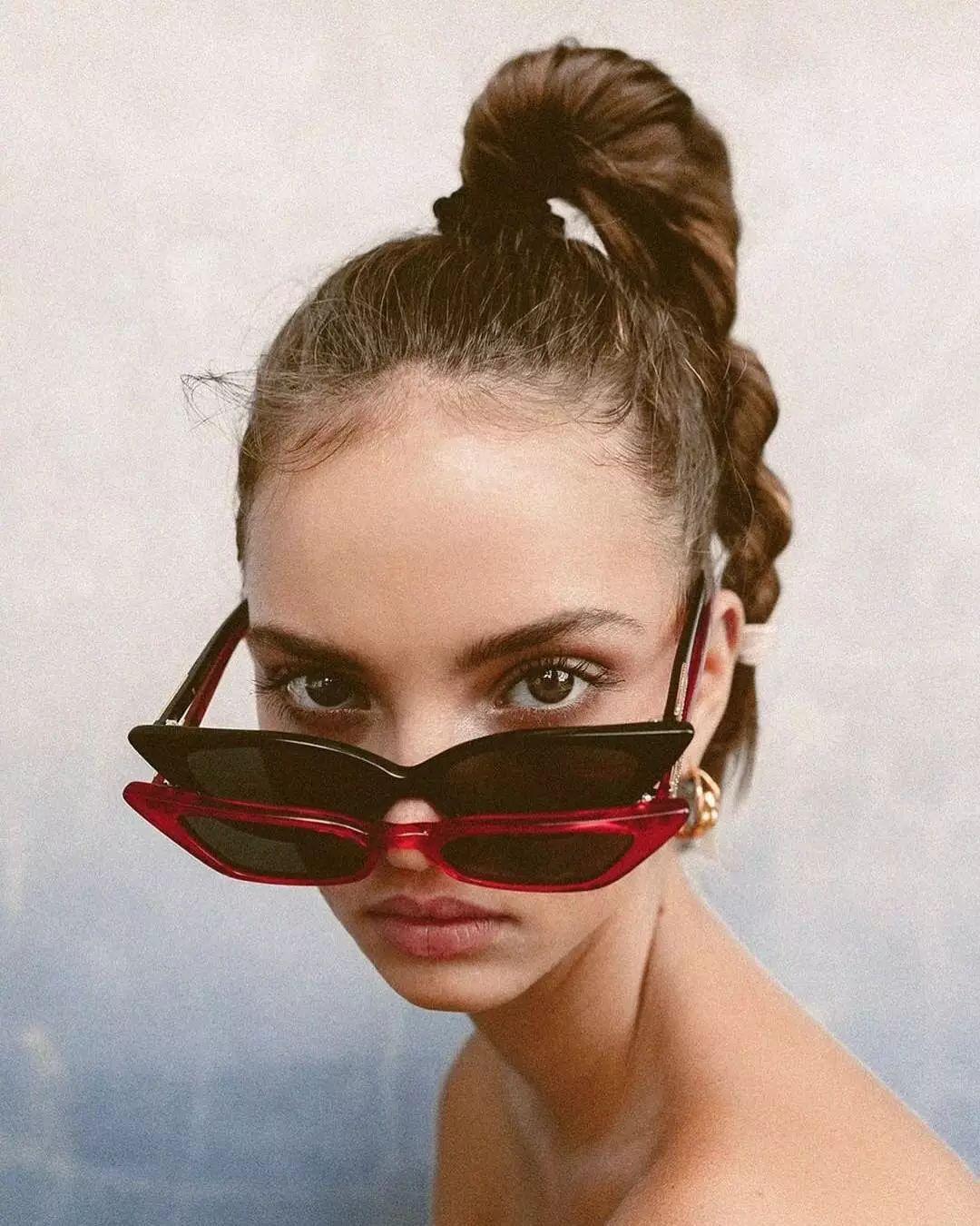 其實(shí)這像是貓眼款的變形,只不過(guò)上面的邊角沒(méi)那么突出。它的特點(diǎn)就是墨鏡上下的邊是水平的,而且很窄,基本上寬度不超過(guò)眉毛,甚至更窄,所以很多人主要拿它凹造型,有時(shí)候都是露出眼睛戴的。