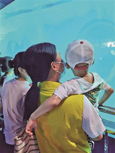 “去海洋館”幾乎是很多重病患兒的夢想,因?yàn)榈挚沽θ?,他們不能進(jìn)入人員密集的公共場所。為了給陽陽創(chuàng)造一個相對舒適和的環(huán)境,潘曉霞東奔西跑,與醫(yī)院、當(dāng)?shù)睾Q箴^以及公益組織協(xié)調(diào),8月10日當(dāng)天,她終于帶著陽陽和其家人一同前往了安安靜靜的、只屬于他們的海洋館??粗AШ蠓阶杂慑塾卧谒械暮k?,陽陽興奮而雀躍,在人生后的時光里,他總算圓了一場“藍(lán)色的夢”。