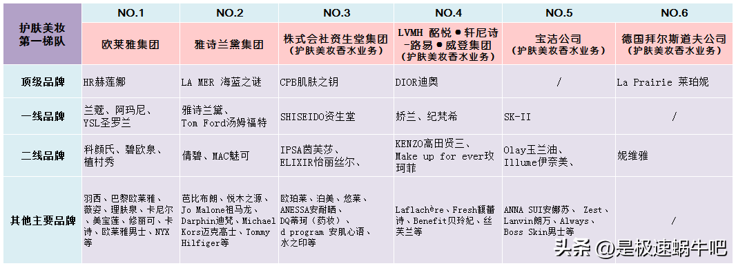 先來看看各個(gè)耳熟能詳?shù)淖o(hù)膚美妝品牌它們的品牌歸屬以及所處等級(jí)。