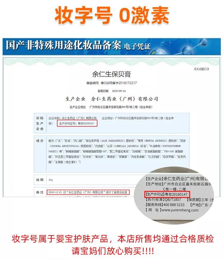 而且余仁生保貝膏外包裝的名字多了“抑菌霜”三個(gè)字,還印有“對(duì)大腸桿菌、金黃色葡萄球菌和白色念珠菌均有抑菌作用”字樣,正規(guī)的妝字號(hào)產(chǎn)品是不可以這樣宣稱的。