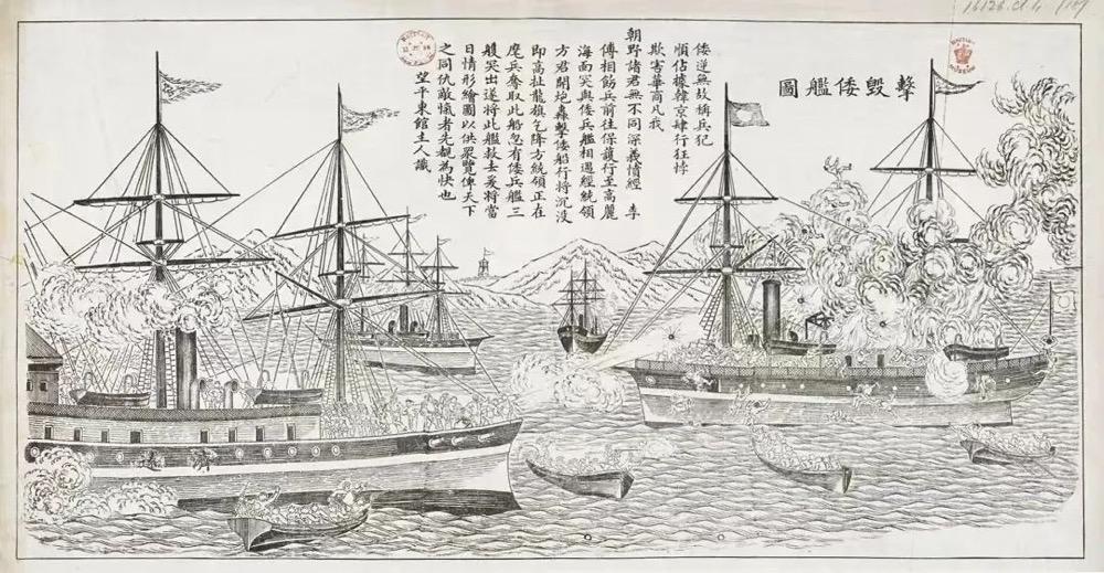《擊毀倭艦圖》,在中方當(dāng)時(shí)的報(bào)道中,甲午海戰(zhàn)是以日軍船毀人亡,大清勝利大捷告終的。