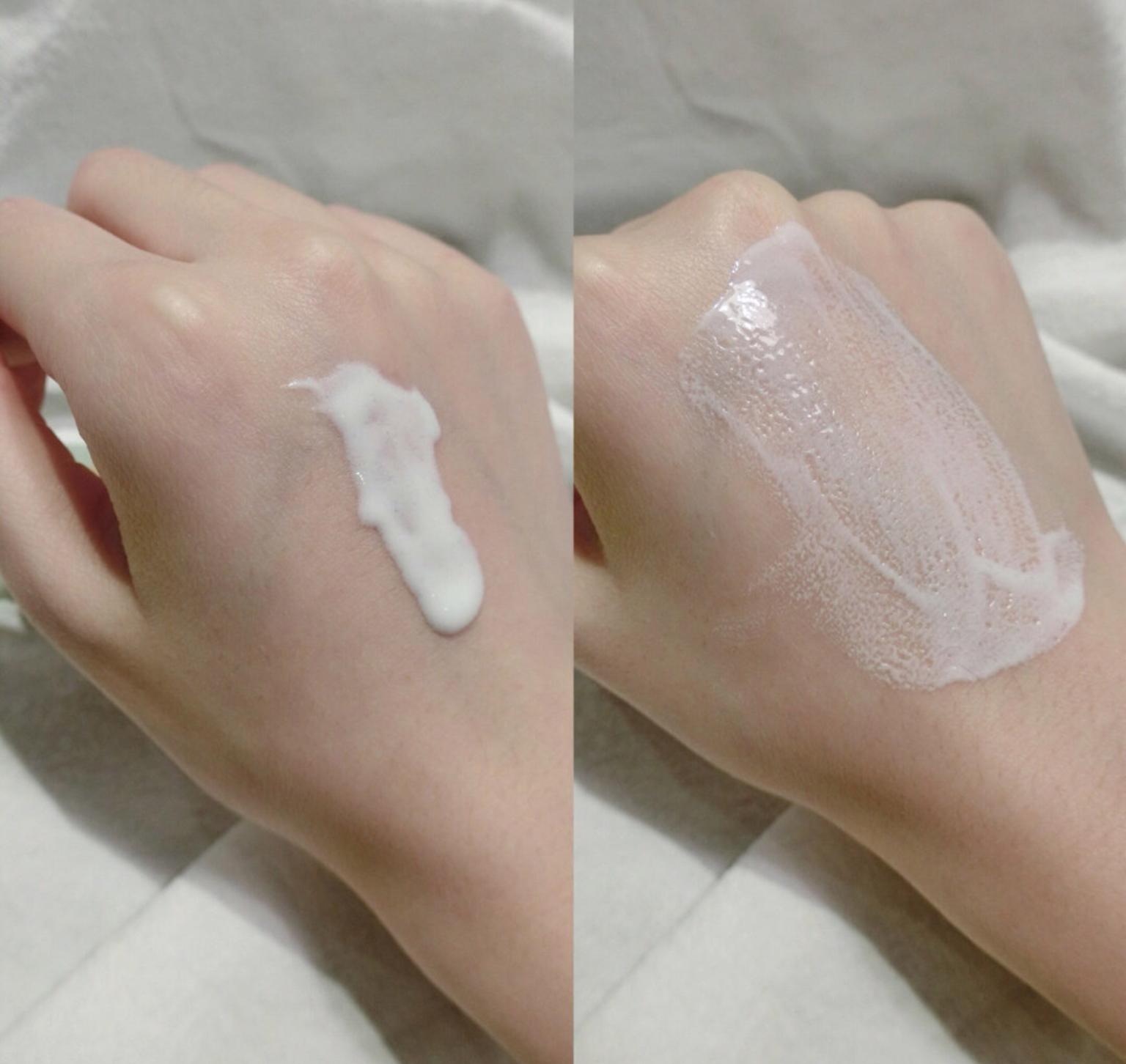 也是乳液狀的質(zhì)地,但不如伊思丁那么水潤,涂在臉上也比較好,推開成膜速度也還好,但是會有一點點提亮膚色的果,還有一點泛白。如果不喜歡假白果的小仙女們還是要慎重,它的一大亮點就是防水。