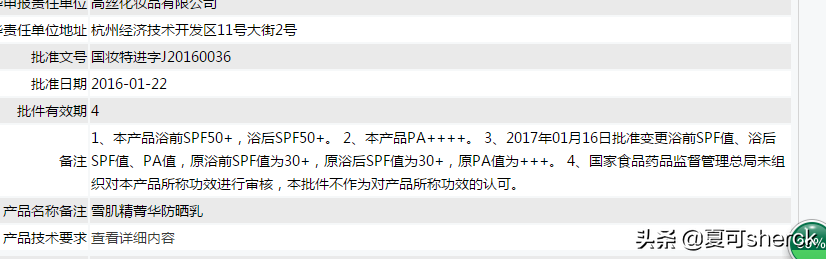 防曬指數(shù)50+PA++++,戶外吧??紤]到防曬劑配伍的可以,你們?nèi)粘2贿^敏,稍微少量點(diǎn)用也可以的。同時注意哦。開頭寫了,他官方說了抗水耐汗。這個是真的!看下藥監(jiān)局備注。