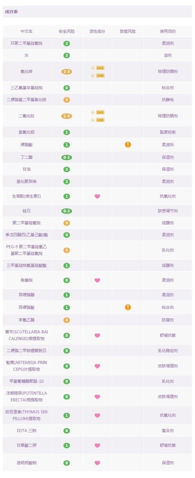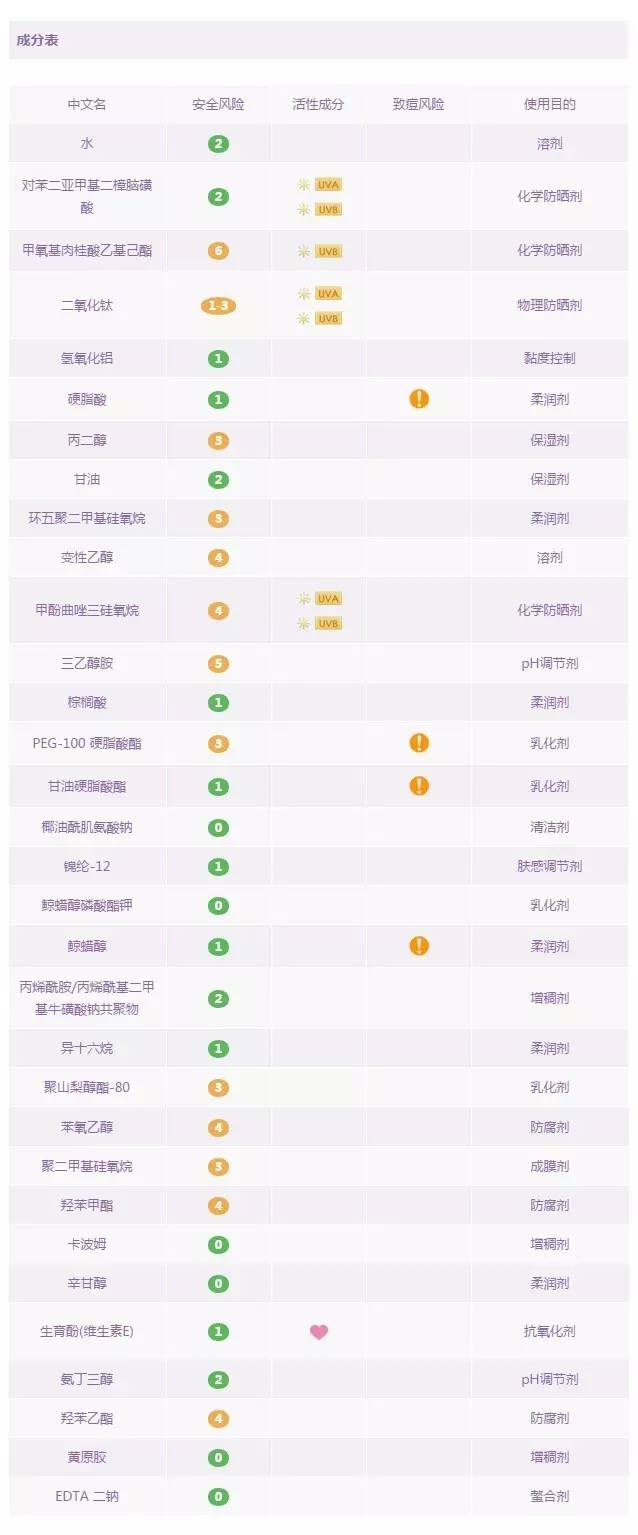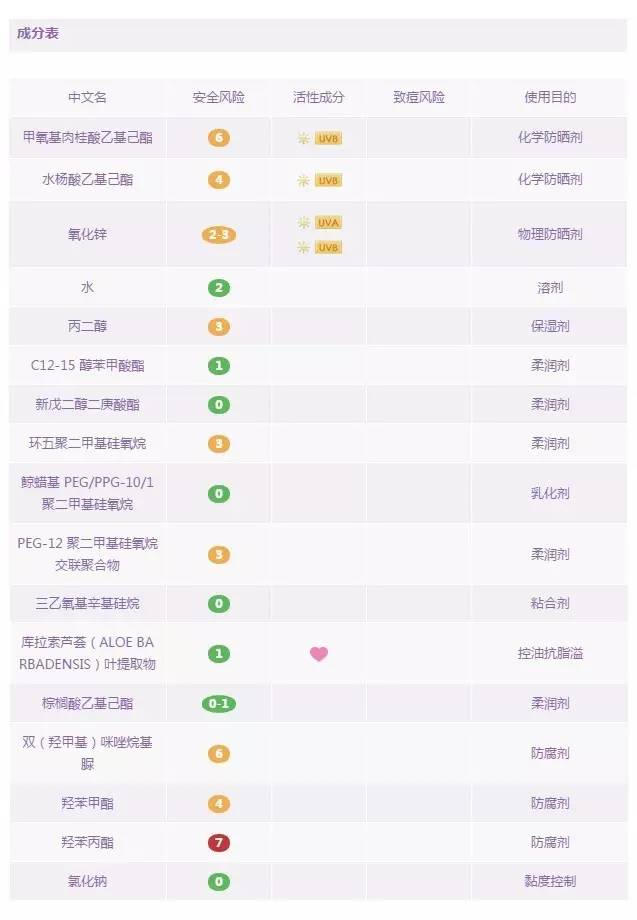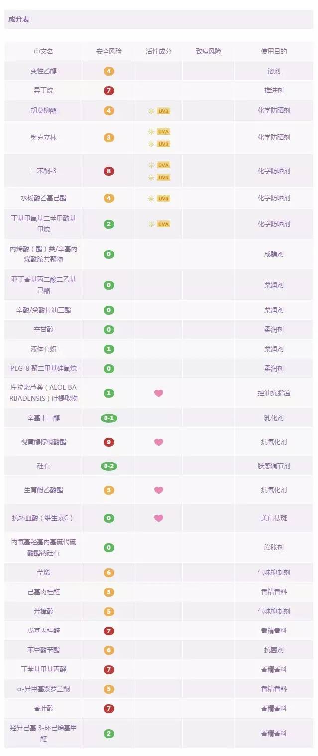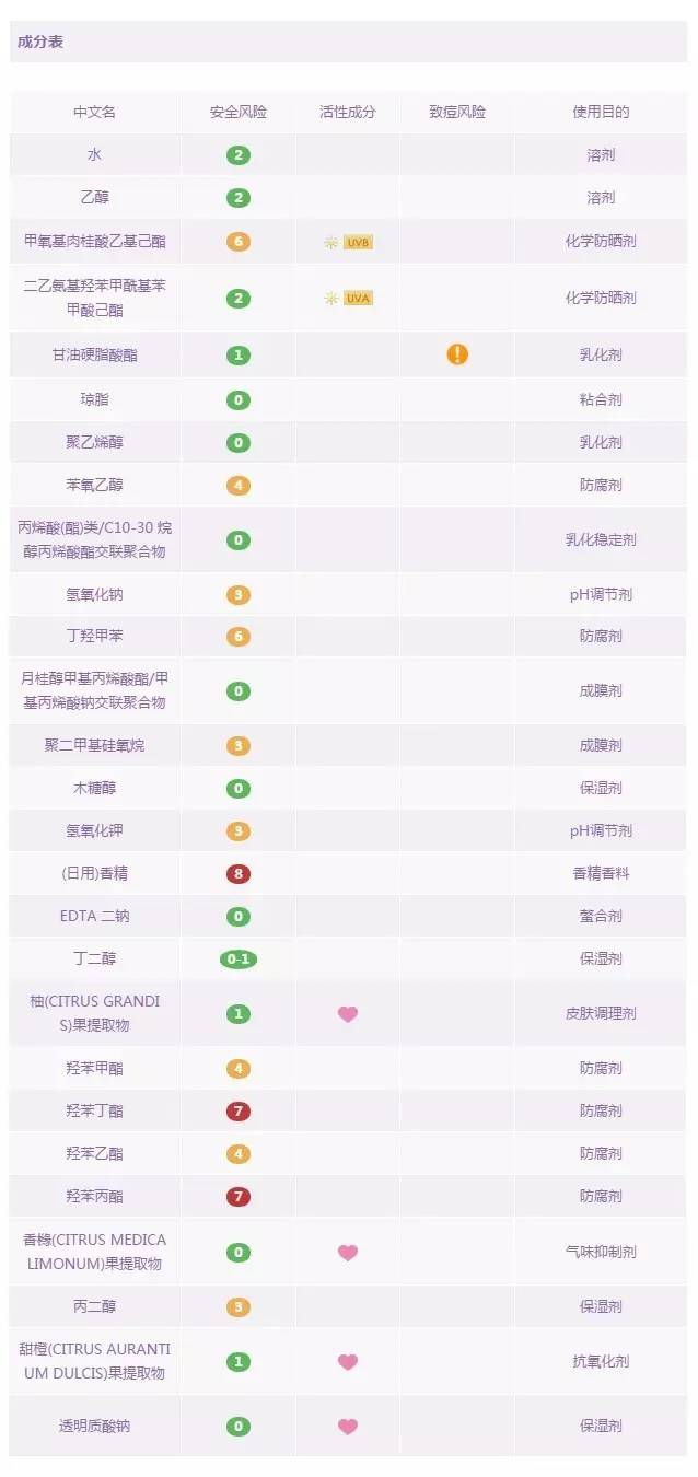 優(yōu)佳是瑞士的一款專業(yè)防曬藥妝品牌,也是瑞士皮膚科醫(yī)生推薦的防曬產(chǎn)品。這款面部專用防曬乳是由化學(xué)防曬劑和物理防曬劑共同搭配的產(chǎn)物。其中含四種化學(xué)防曬成分:奧克立林,丁基甲氧基二苯甲?;淄?,二乙基己基丁酰胺基三嗪酮,雙-乙基己氧苯酚甲氧苯基三嗪,和一種物理防曬成分:二氧化鈦 。這款產(chǎn)品難得的是:不含防腐劑,不含香料,不含高風(fēng)險成分,以及孕婦慎用成分。這種難得在防曬產(chǎn)品中少見,因此,推薦給各位媽媽和寶寶們,讓它來守護你們,叔比較放心。但遺憾的是,里面依然含有乙醇,酒精過敏者還是小心一下吧。