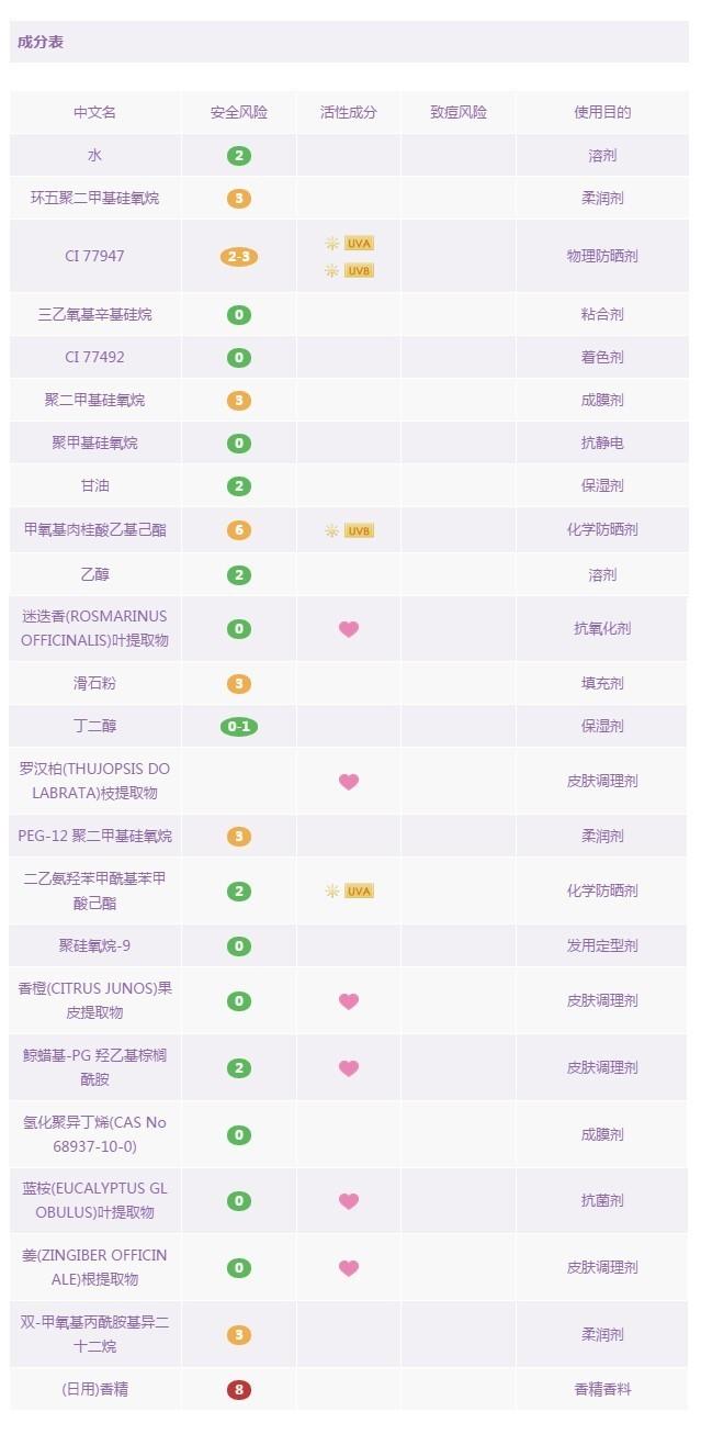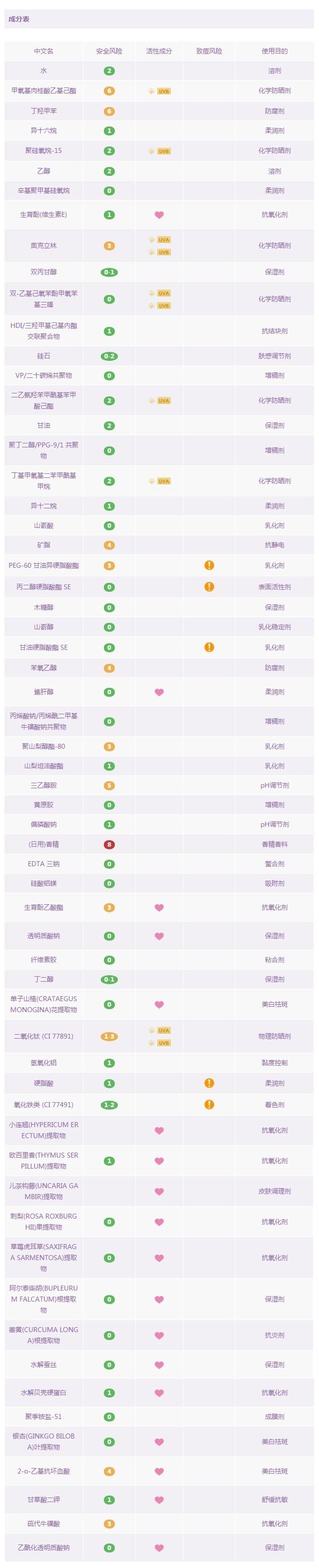cpb是日本的高端護膚品牌,它bling~bling~的外包裝很容易讓人產(chǎn)生一種晃眼的貴婦感。那我們先來看看這款產(chǎn)品的成分是不是也這么bling~bling呢?它含6種化學(xué)防曬成分:甲氧基肉桂酸乙基己酯,聚硅氧烷-15,奧克立林,雙-乙基己氧苯酚甲氧苯基三嗪,二乙氨羥苯甲?;郊姿峒乎ィ』籽趸郊柞;淄?。 和1種物理防曬成分:二氧化鈦。防曬劑的紫外線波段配合比較且合理。之前說到奧克立林(Octocrylene)暴露在陽光下會釋放出氧自由基,于是其中加入了抗氧化的成分:維生素E(生育酚) ,且排在成分表比較靠前的位置,可以看出用料的良心,以及一系列的活性提取物的添加,也讓這款產(chǎn)品在防曬+修色的同時,同樣可以作為一款日間護膚品使用。