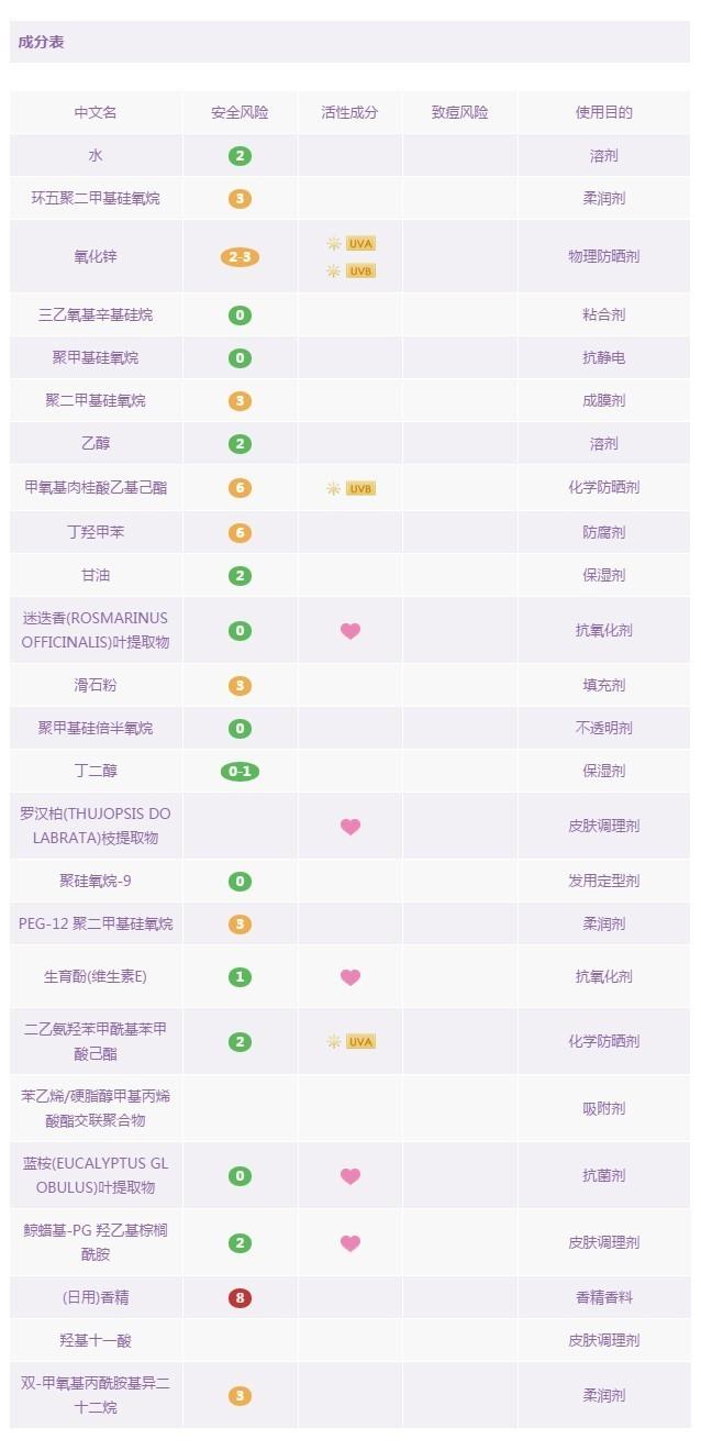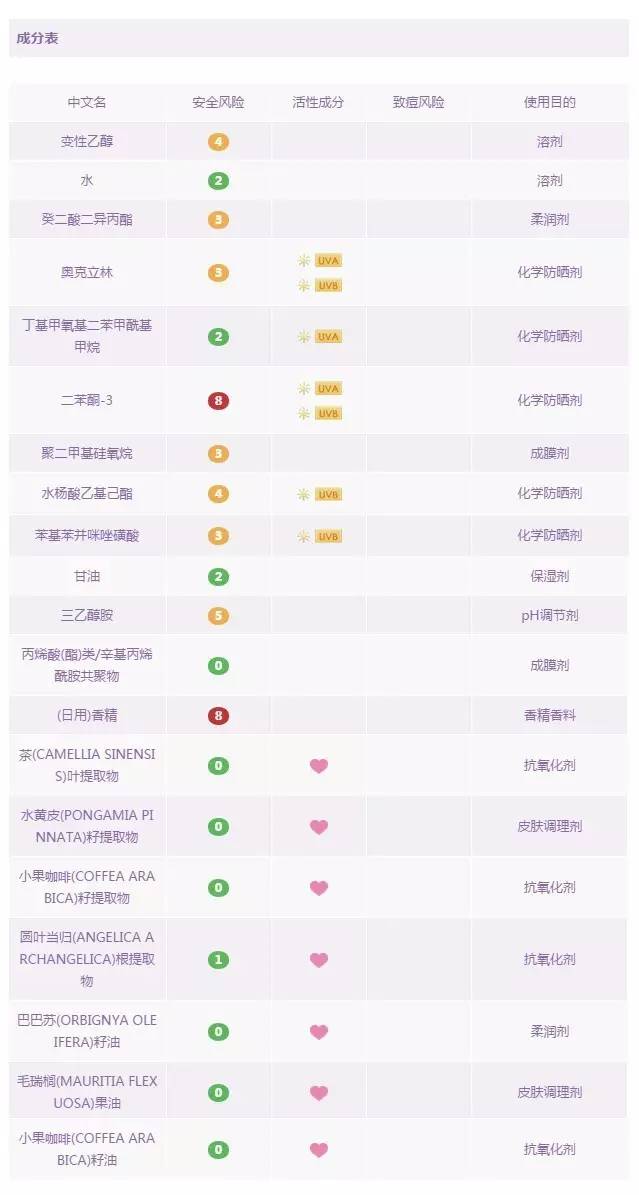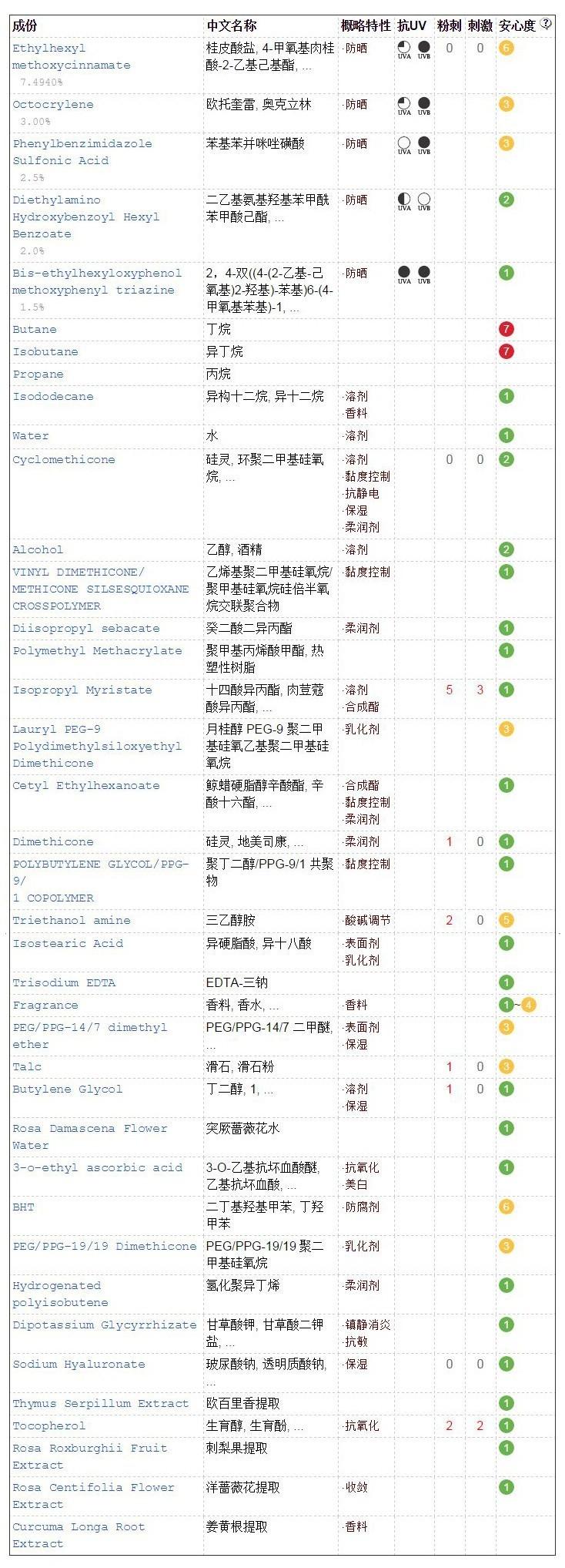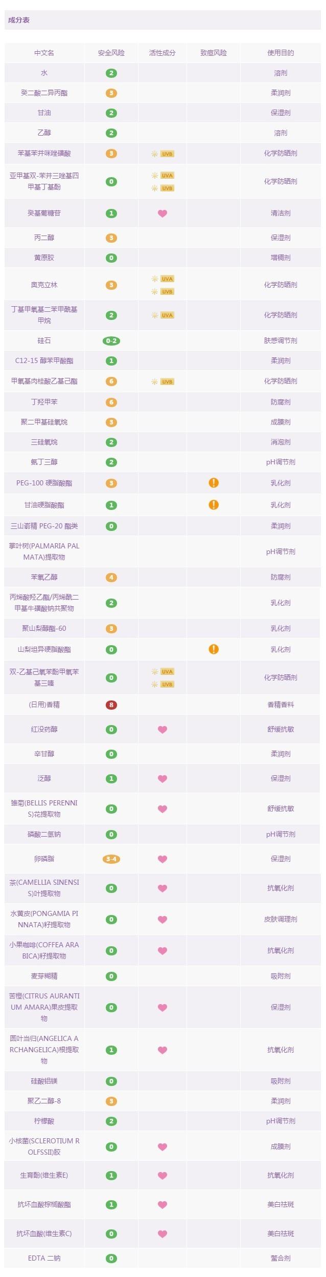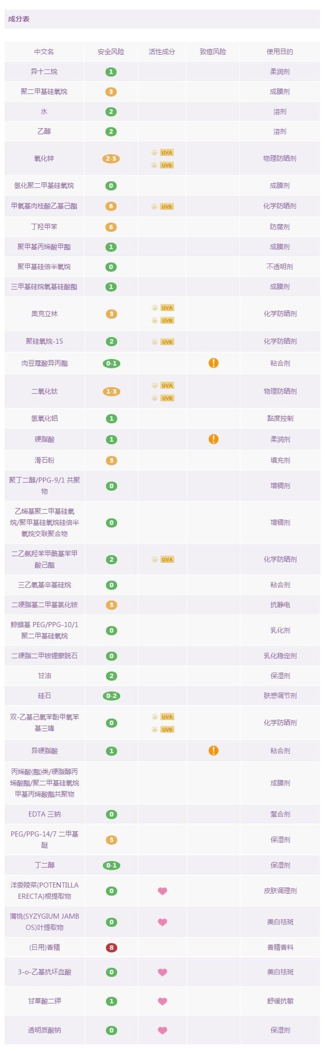 POLA是日本高端護膚系里比較低調(diào)的一個品牌。他主打的抗糖化成分,也是一種新型的美白理念。這款防曬質(zhì)地很清爽,且氣味和膚感都透著雅致的尊貴感。且抗糖化的活性物添加,讓它同時可以兼?zhèn)浞罆窈兔腊椎碾p重功。我個人還是對它偏愛有加的。這款同樣是物理結(jié)合化學(xué)的綜合型防曬,其中物理防曬成分:二氧化鈦,氧化鋅?;瘜W(xué)防曬成分:二乙氨基羥苯甲?;郊姿峒乎?,雙-乙基己氧苯酚甲氧苯基三嗪,甲氧基肉桂酸乙基己酯。防曬波段配合較為合理,成分也比較。但是里面依然沒有避免的使用了酒精和香精的成分,因此還是要提醒一下對這兩種物質(zhì)過敏的敏感肌妹子們,小心一點。