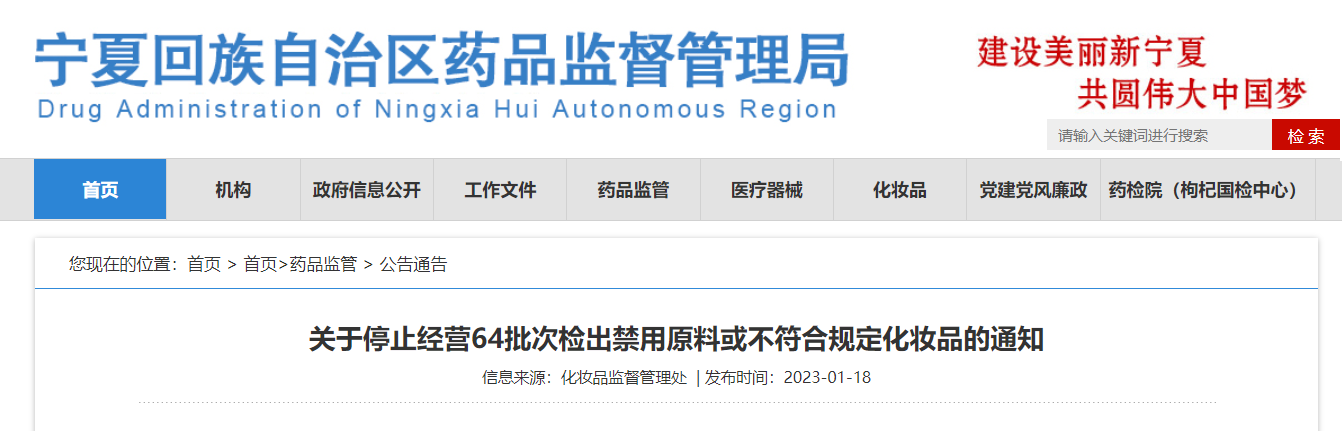 關(guān)于停止經(jīng)營(yíng)64批次檢出禁用原料或不符合規(guī)定化妝品的通知