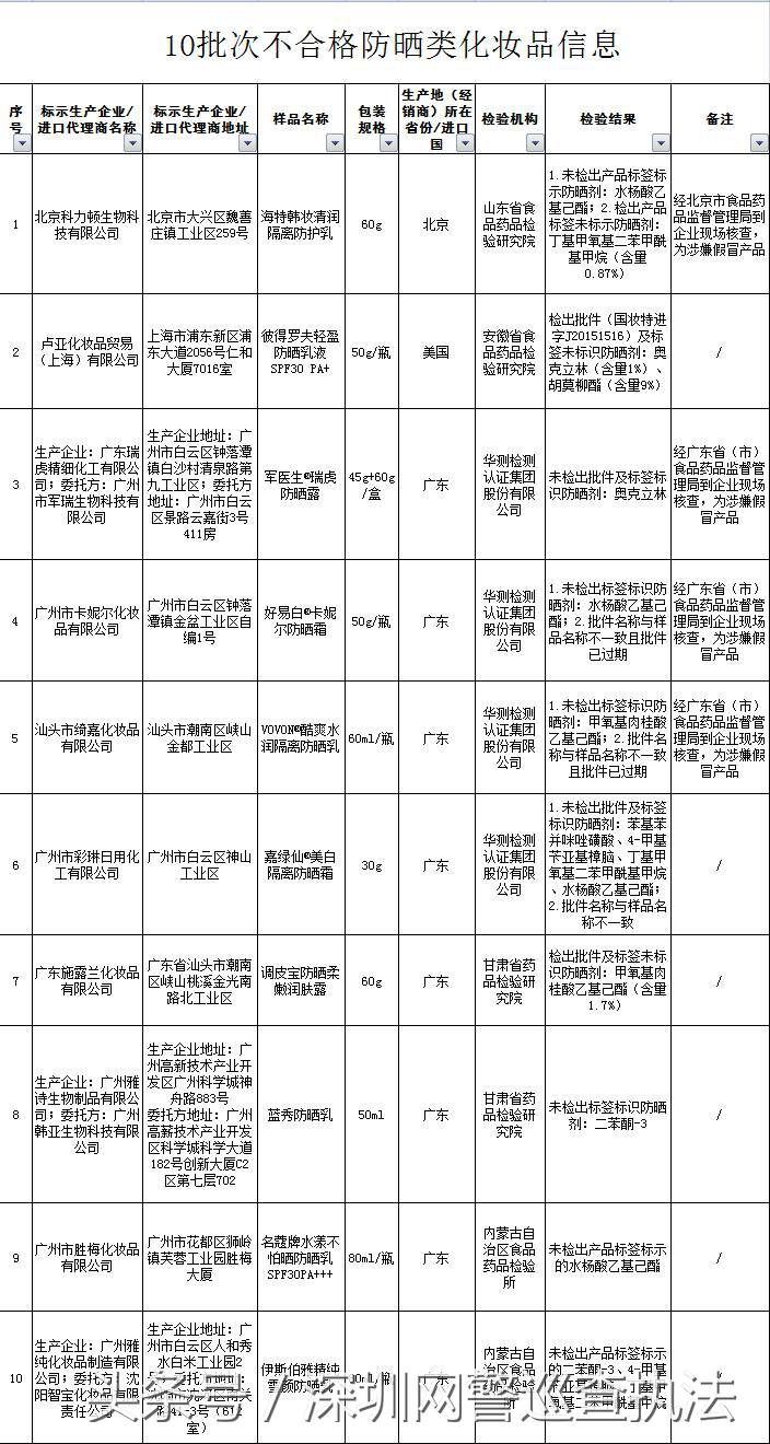 近日,食品藥品監(jiān)督管理總局在官網公布了10批次不合格防曬化妝品。