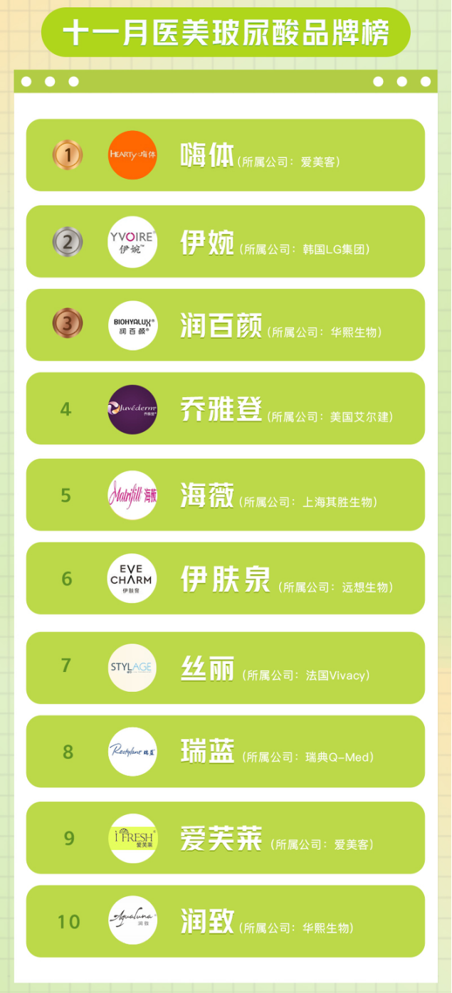 2、11月中國(guó)醫(yī)美品牌美商指數(shù)榜顯示,嗨體奪回“王位”,“新面孔”玻尿酸品牌「潤(rùn)致」上榜。