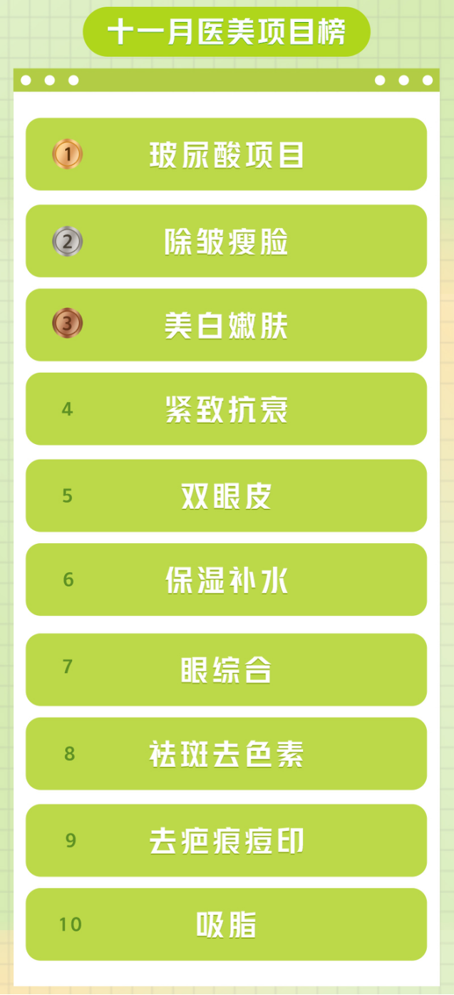 11月中國(guó)醫(yī)美項(xiàng)目美商指數(shù)榜顯示,玻尿酸項(xiàng)目、除皺瘦臉、美白嫩膚依舊是求美者喜愛(ài)的三大“變美功課”。