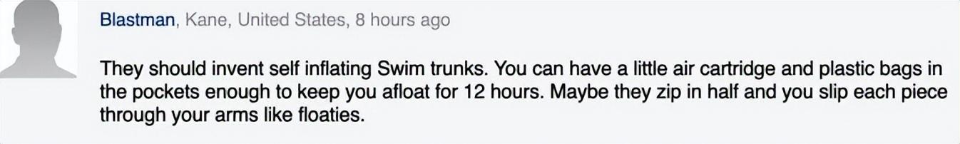 還有人打開腦洞構(gòu)思了充氣泳褲:“你可以在口袋里放一個小氣筒和塑料袋,這就能讓你漂浮12小時。也許它們還能拉成兩半,然后你把它們夾在兩條手臂之間,就像救生衣那樣?!?/span>