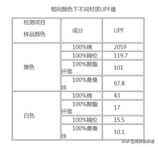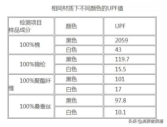 結(jié)果顯示相同顏色下,棉的普通衣物防紫外線性能比以聚酯纖維、錦綸為主要材質(zhì)的防曬衣要好。
