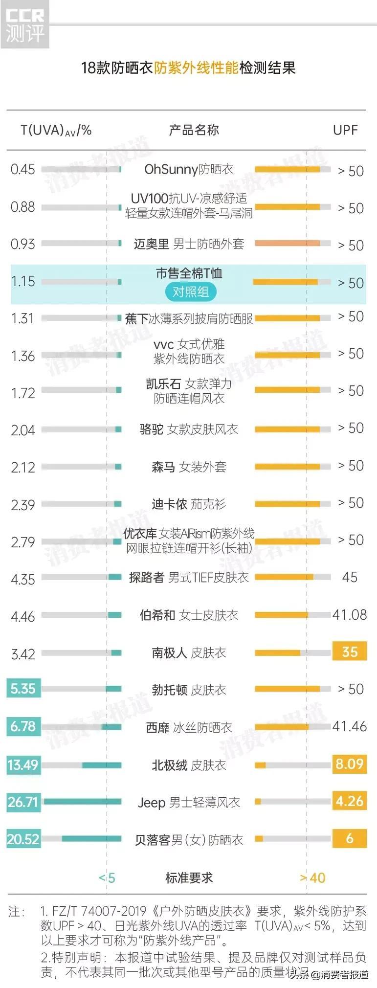 普通全棉衣物,防曬果也不差在實際測試時,我們發(fā)現(xiàn)了一個有意思的點,作為對照組的普通全棉T恤也有不俗的防曬果,甚至超過了部分知名品牌的防曬衣,如迪卡儂、凱樂石、森馬等。