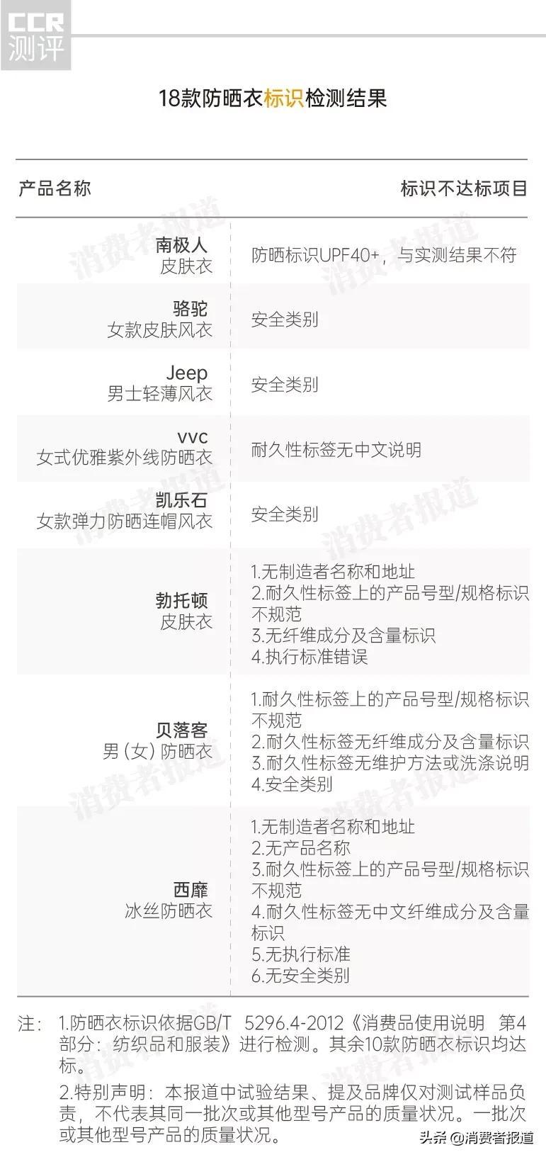 通過對18款防曬衣樣品標(biāo)簽的解讀,《消費者報道》發(fā)現(xiàn),將近一半產(chǎn)品不符合標(biāo)準(zhǔn)規(guī)定。其中,南極人皮膚衣在吊牌上標(biāo)示其UPF 40+,與實測值35不符,涉嫌虛標(biāo);駱駝、Jeep凱樂石、貝落客等4款類別標(biāo)示為“C類”, 與實際穿著情況不符,按照GB 18401-2010 《紡織產(chǎn)品基本技術(shù)規(guī)范》,C類為非直接接觸皮膚的紡織產(chǎn)品,而輕薄的“防曬衣”“皮膚衣”產(chǎn)品一般都是夏季貼皮膚穿著,類別應(yīng)為“B類:直接接觸皮膚的紡織產(chǎn)品”。