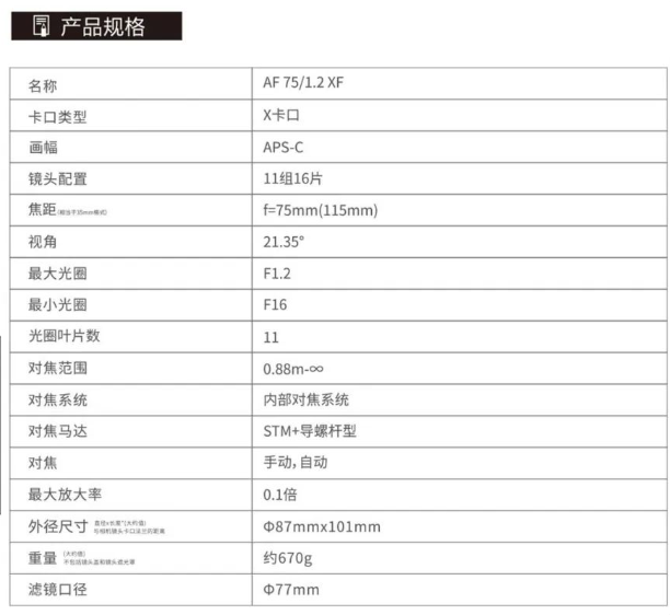 唯卓仕 AF 75mm F1.2 XF 主要參數(shù):