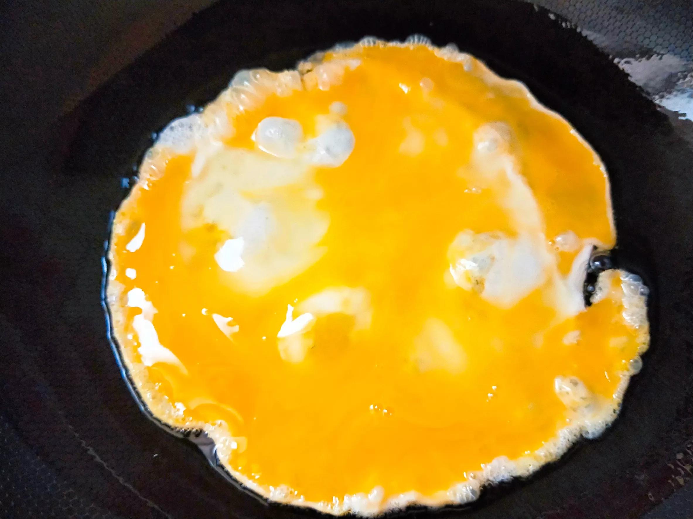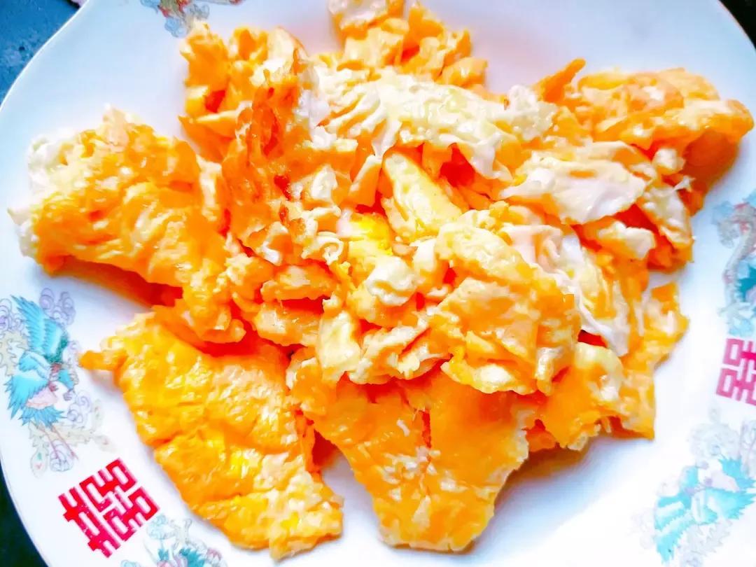 3,起鍋燒油,油熱后,改中火,倒入雞蛋液,轉(zhuǎn)動鍋,使蛋液布滿鍋底,成型后翻面,用鍋鏟搗成塊,再翻炒一下,炒成金黃色,即可出鍋備用。