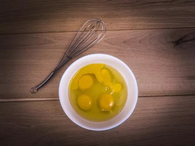 2,碗中打入四個雞蛋,倒入少許料酒、白胡椒粉和鹽打散備用。