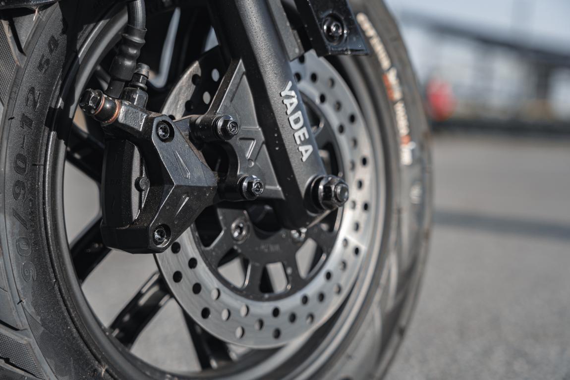 前后220mm對置缸大盤碟剎,制動會更,基本上是捏剎車制動就會有,且制動效果很到位,如果你真遇到復雜路況,雅迪冠能3 E9 Pro的制動效果在關鍵時刻依舊給力的。