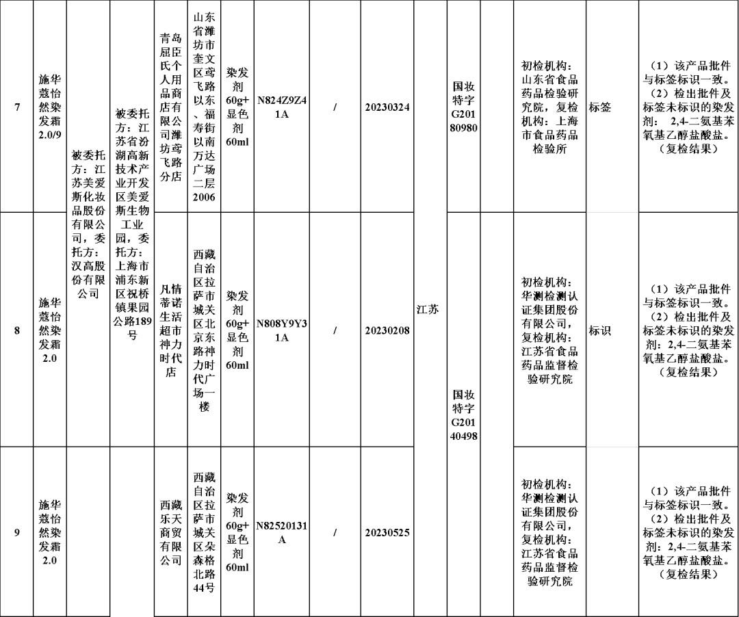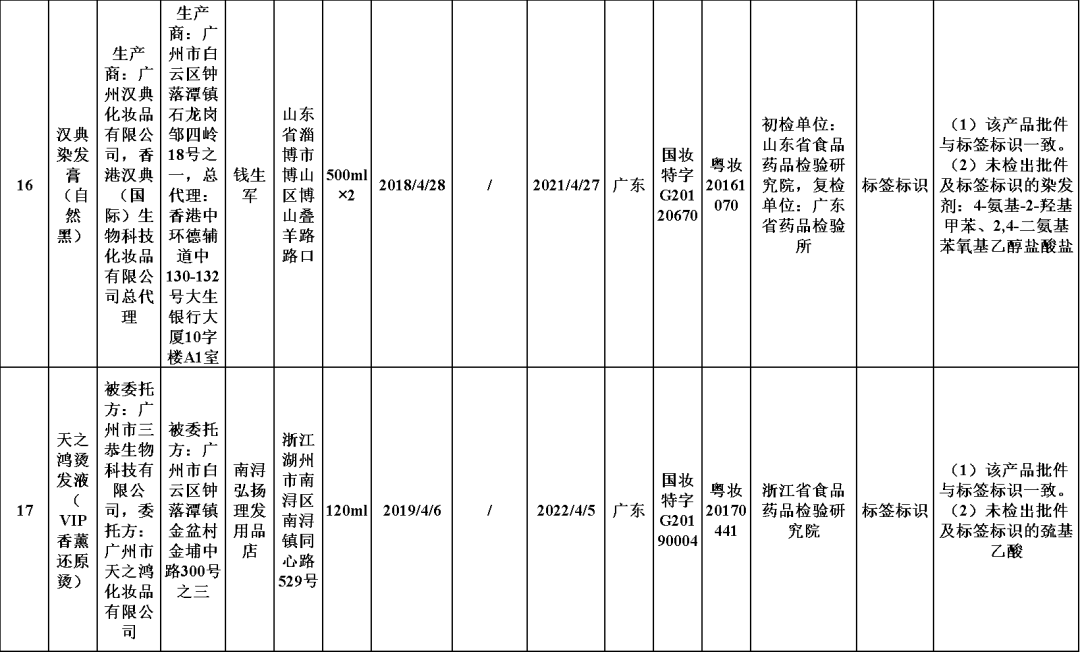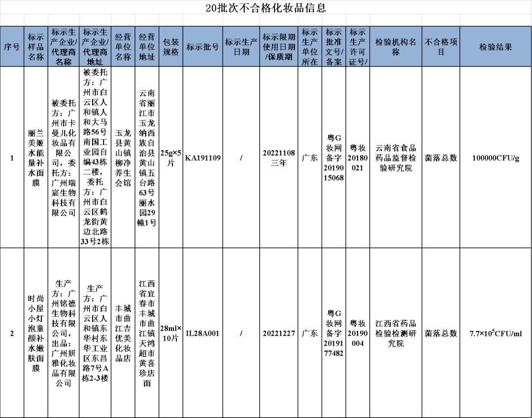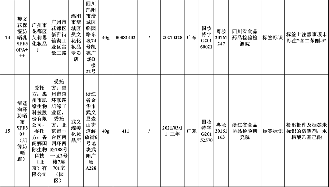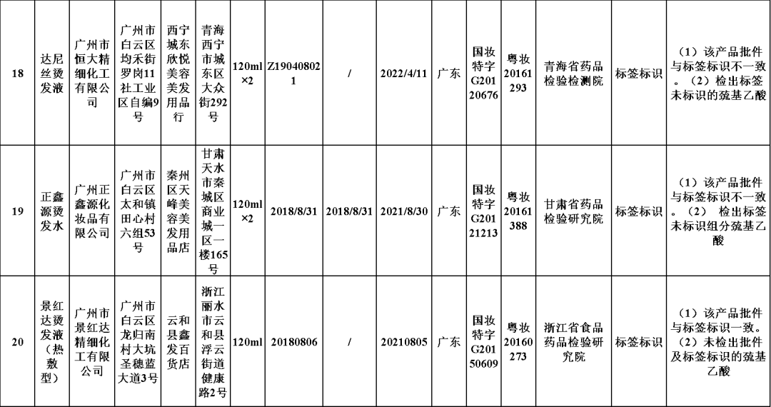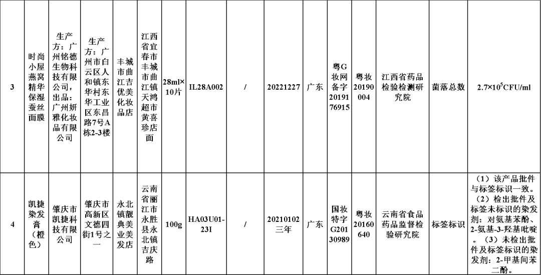 2021年1月28日,藥品監(jiān)督管理局網(wǎng)站發(fā)布的《關(guān)于20批次不合格化妝品的通告(2021年第11號)》顯示,在2020年化妝品監(jiān)督抽檢工作中,經(jīng)云南省食品藥品監(jiān)督檢驗(yàn)研究院等單位檢驗(yàn),標(biāo)示為肇慶市凱捷科技有限公司等生產(chǎn)的凱捷染發(fā)膏(橙色)等10批次染發(fā)類產(chǎn)品,廣州瑞宸生物科技有限公司生產(chǎn)的麗蘭美姬水能量補(bǔ)水面膜等3批次面膜類產(chǎn)品,廣州市花都區(qū)芙莉思化妝品等生產(chǎn)的樊文花保濕防曬乳SPF30PA+++等2批次防曬類產(chǎn)品,廣州市天之鴻化妝品有限公司等生產(chǎn)的5批次燙發(fā)/脫毛類產(chǎn)品不合格。