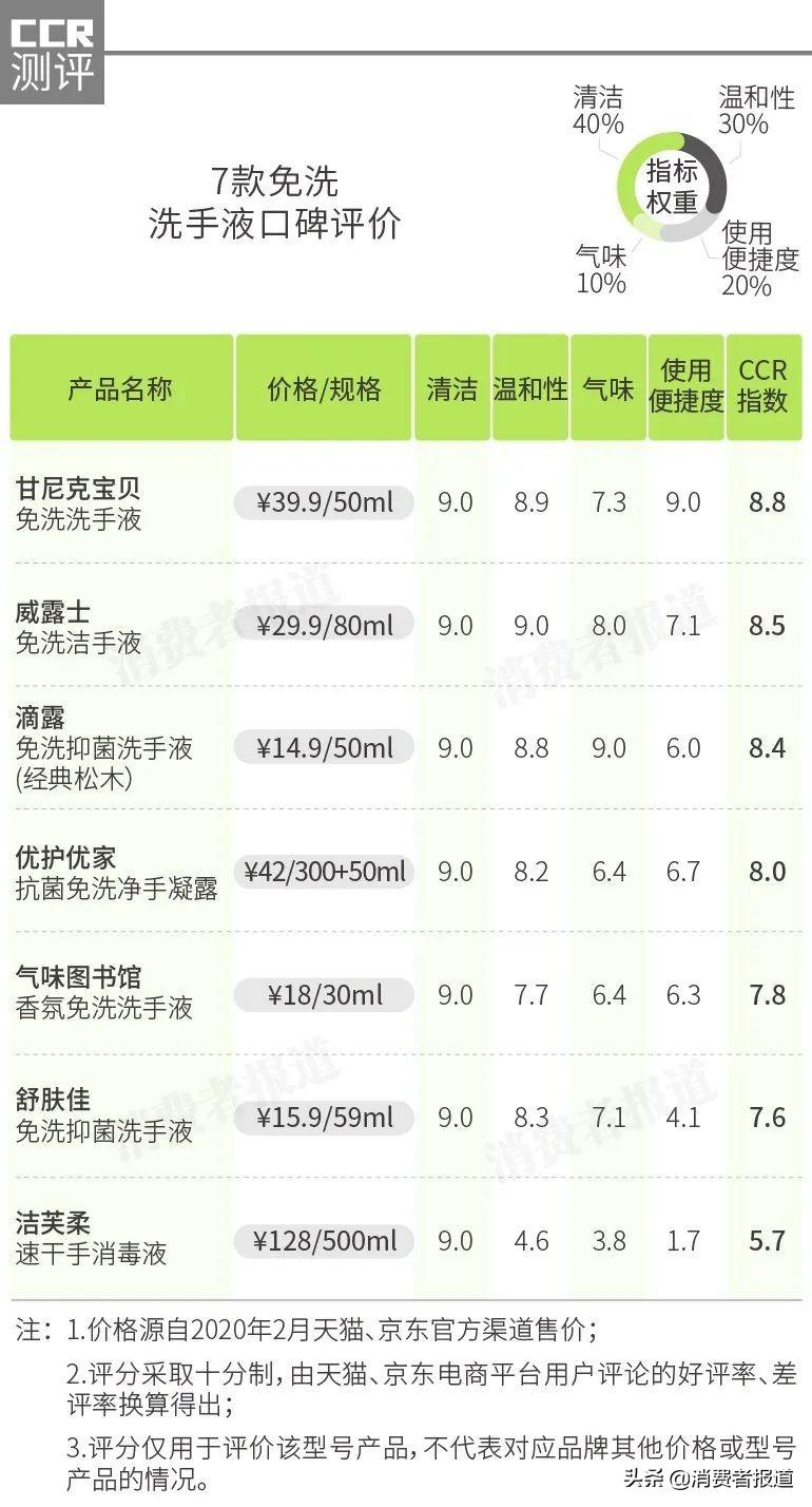 2.免洗洗手液:甘尼克寶貝、威露士評價(jià)結(jié)果排名靠前,而潔芙柔速干手消毒液綜合評價(jià)靠后,氣味刺鼻、攜帶不方便成為主要扣分項(xiàng)。