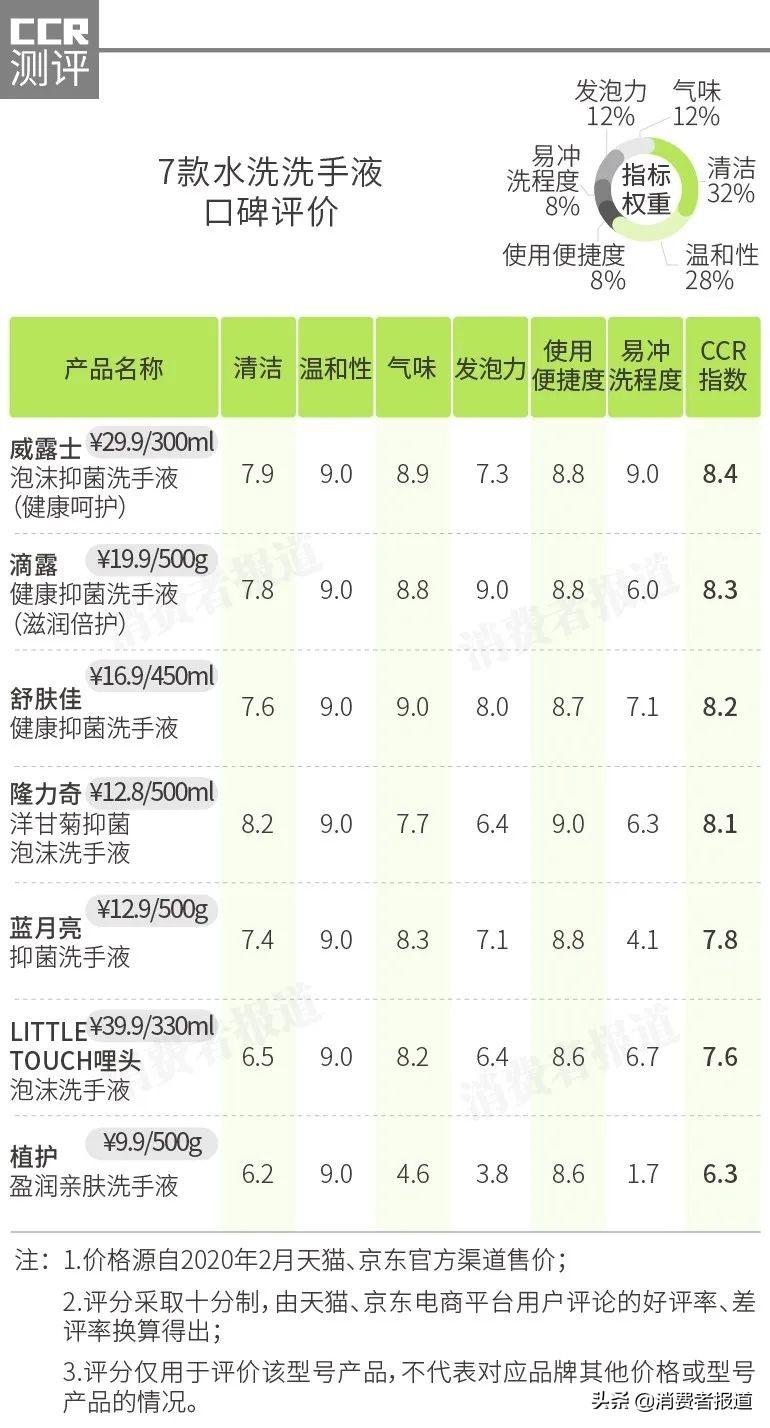 口碑結(jié)果1. 水洗洗手液:威露士、滴露更為消費(fèi)者青睞,而植護(hù)盈潤親膚洗手液在清潔效果、氣味、發(fā)泡力及易沖洗程度評價(jià)均不高,排名墊底,不被推薦。