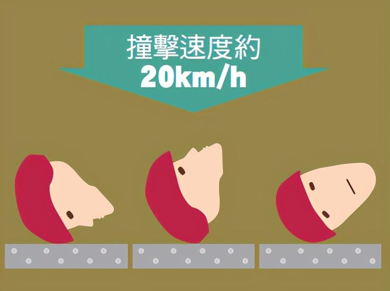 首3個撞擊以頸椎與水平線成25度角,撞向頭部的正前方、后方及側面,撞擊速度約為20km/h。