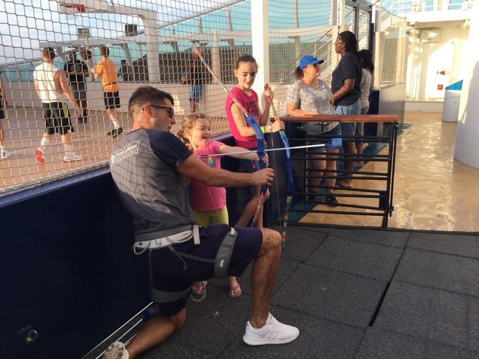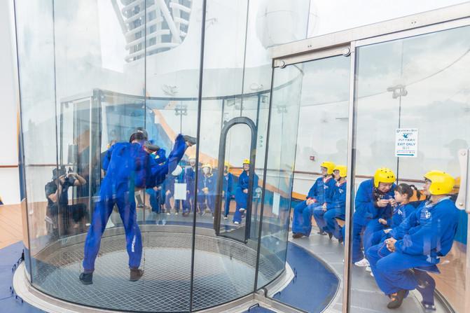 在甲板沖浪的正上方就是從量子船系延續(xù)到海洋光譜號的甲板跳傘,專門為不敢體驗高空跳傘的游客而設(shè)立。游客身著專業(yè)服裝,在圓筒形的玻璃罩里,享受自由落體帶來的快感,想想都讓人有點迫不及待了。