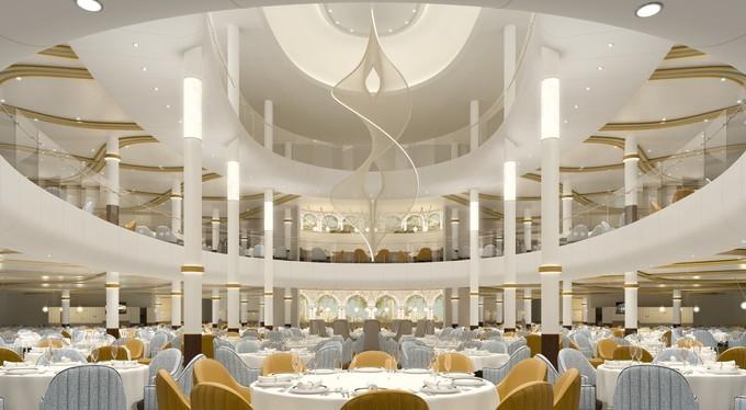 再來說一下這里大的主餐廳,光譜號的主餐廳經(jīng)過了改造,由4間獨立主餐廳合并成為3層挑高、可容納1884人的盛宴式餐廳,在這里每天都會供應(yīng)中西兩種不同的菜譜,每天變換的統(tǒng)一菜單,用餐方式采用單點,由賓客自主選擇分餐或共享。