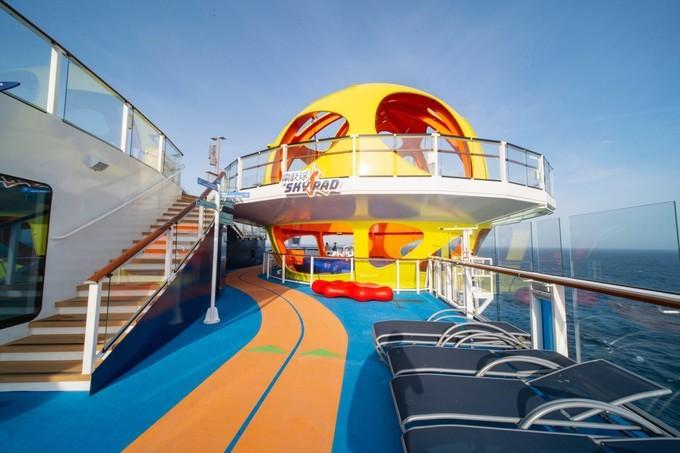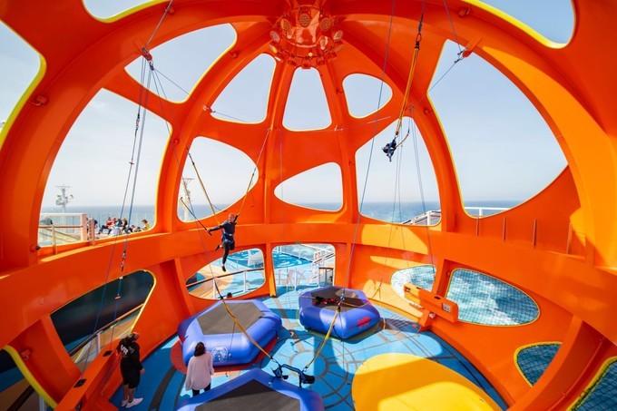 值得一提的是光譜號上的新增明星娛樂設(shè)施南極球,在船尾的左舷,橙色球體十分引人注目,里面設(shè)置有四個蹦極床,可以模擬地心穿越的VR體驗,不管是小朋友們還是成年人都尤其喜愛,甚至玩過一遍都還愿意再排一次隊。